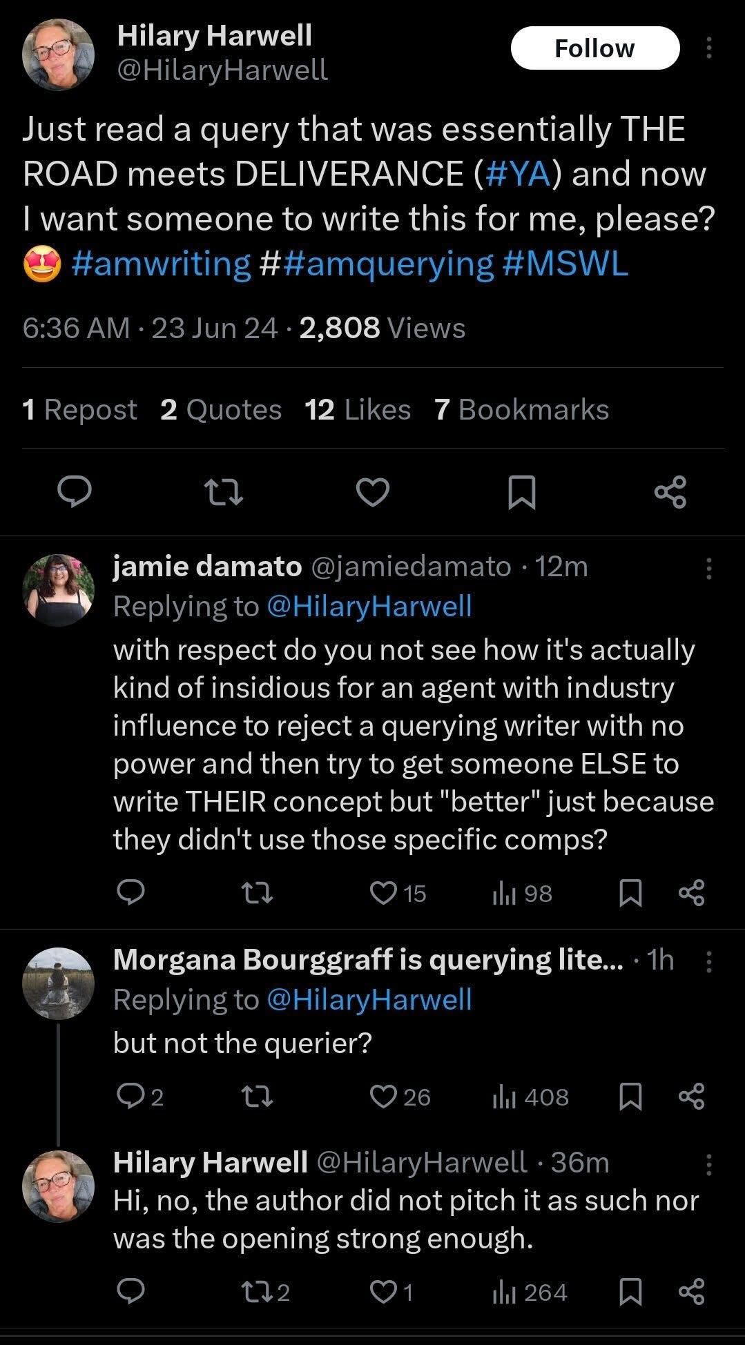 And last, and certainly not least, is dear Hilary Harwell. Who asked the writing community at large to write a book that is ‘essentially The Road meets Deliverance’ AFTER rejecting an aspiring author for this very concept. When other writers confronted Hilary about the rejected query, she buckled down and said the opening was not ‘strong enough’.