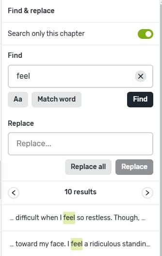As I’m working through the line edits of my novella, the quickest way I’ve devised for finding this ‘telling’ language is by using CTRL+F. I’m using Reedsy to write my novel, but this also works in Google Docs, Microsoft Word, and Dabble.